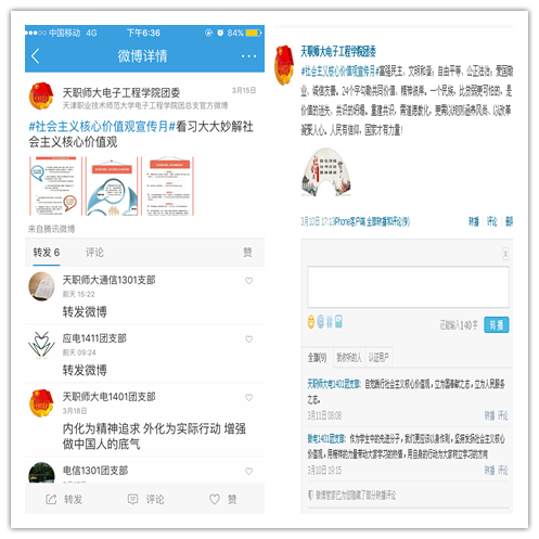 电信1301班团支部创新团日活动形式,利用班级微博解读社会主义核心价值观有关内涵,并转载了2015感动中国十大人物王宽老人的感人事迹,班级同学通过线上微博发表说说并转发评论,参与人数达半数以上。