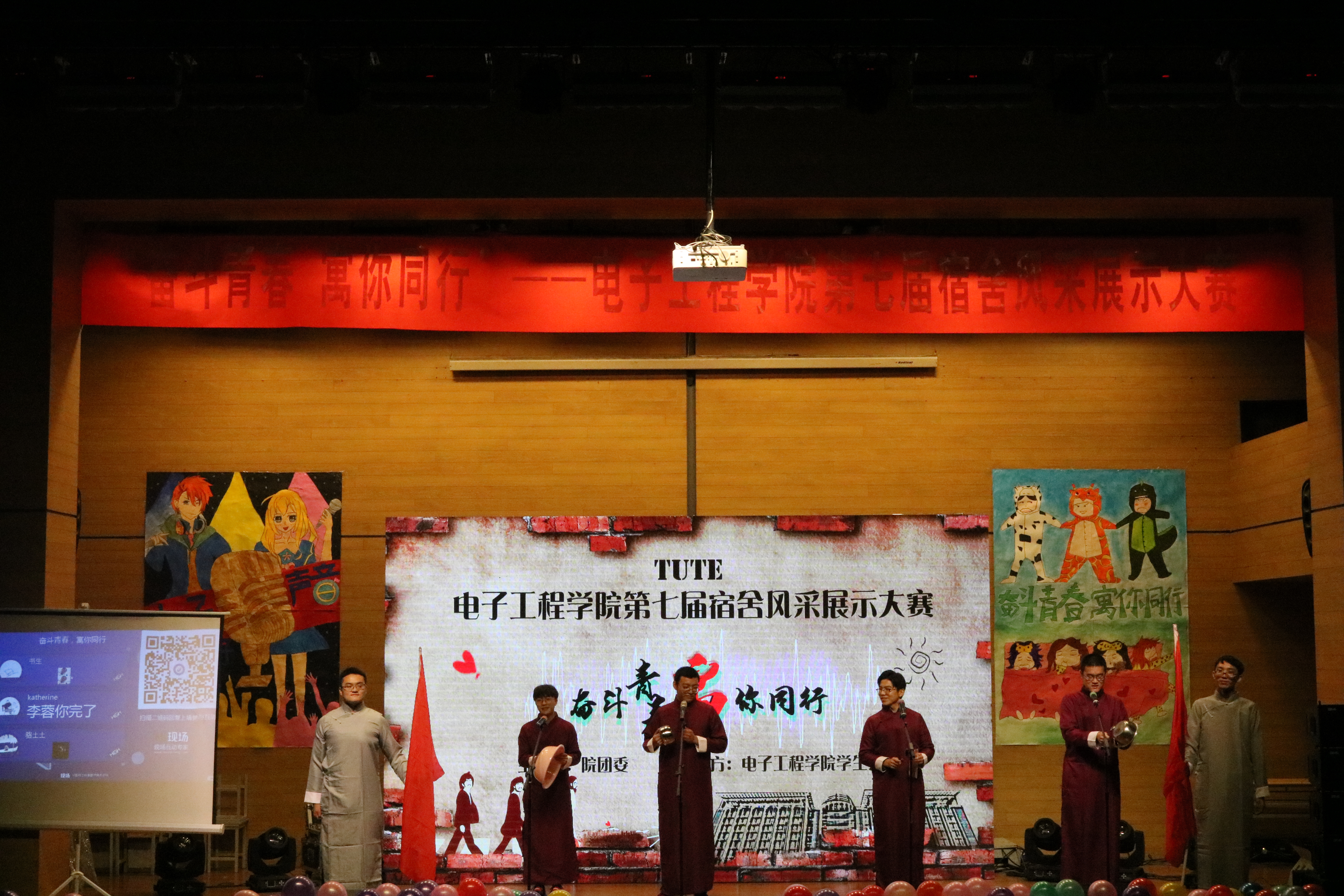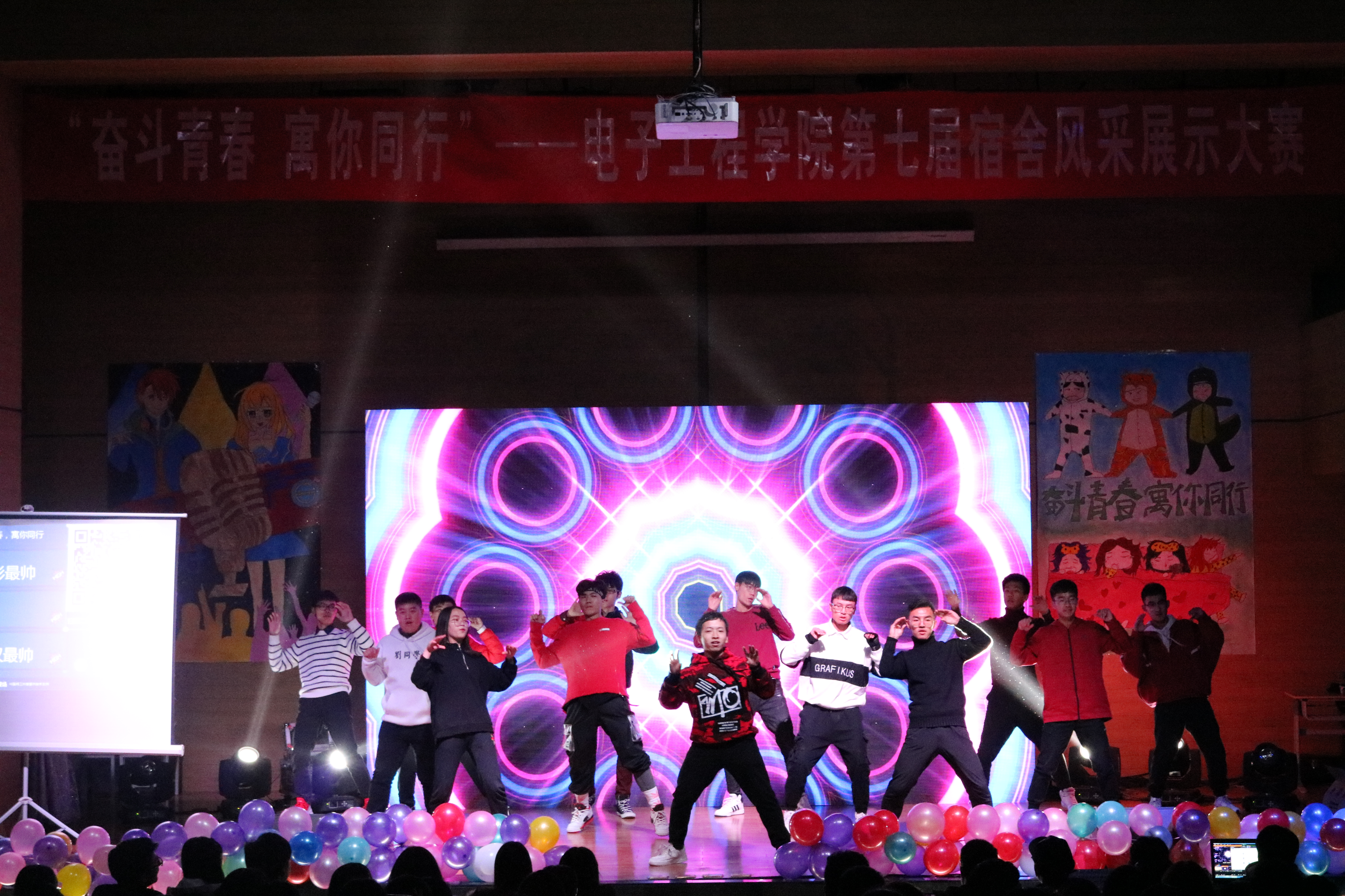 在决赛现场,2018级班长们用热情活泼的舞蹈串烧《MOMOLAND+GOGO+葫芦娃》拉开当晚比赛的序幕。接下来进入决赛的8支宿舍代表团通过个性化视频介绍依次亮相登场,创意无限。在展示环节中,1号学生公寓301宿舍的歌曲串烧《6A级风景区》、13号学生公寓218宿舍的《超强音浪》通过热情的歌声和炫酷的吉他弹唱彰显出新生的蓬勃朝气;1号学生公寓220宿舍的歌舞表演《Dancy Party》、13号学生公寓111宿舍的《宇宙泰山》活泼灵动,再现宿舍同学间亲密友好的关系;1号学生公寓219宿舍带来唱跳表演《爱你》,用甜美的歌声和优美的舞姿诠释青春的热情;13号学生公寓814宿舍的原创三句半作品《咱们不一样》,形式新颖,语言风趣,刻画出学生眼中独特的电子风采;13号学生公寓204217813宿舍联袂带来主题表演《致青春-年少之路》展示出少年们拥抱青春,勇于奋斗的精神面貌;13号学生公寓513宿舍压轴带来经典童年歌曲《月亮船》,将我们带回了童年时代,回忆满满。