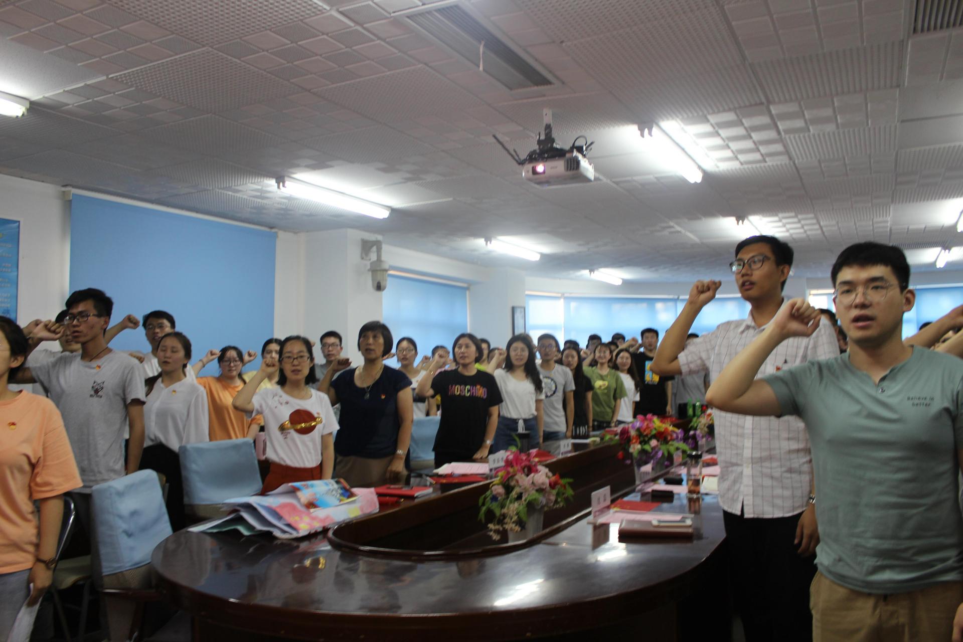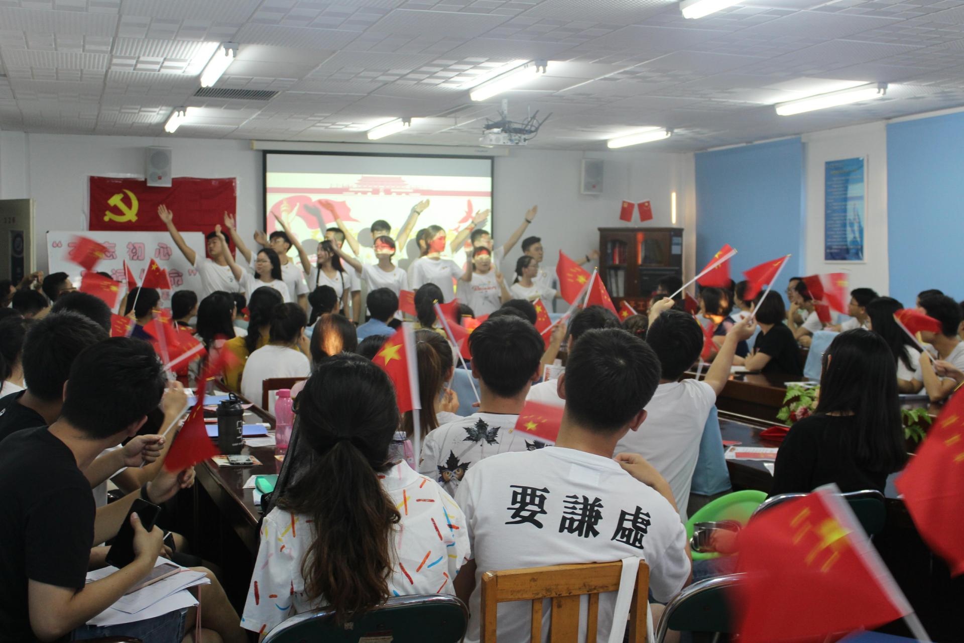 会议开始,全体师生党员齐唱《没有共产党就没有新中国》与《我爱你中国》,在激昂的歌声中感悟共产党的光辉岁月,党员手中拿起国旗,表达对党和国家的热爱。紧接着,全体参会人员观看短片《不忘初心》,学习优秀党员代表对于“不忘初心”的光荣践行事迹,认真学习习近平总书记对于“初心”的精准阐释。