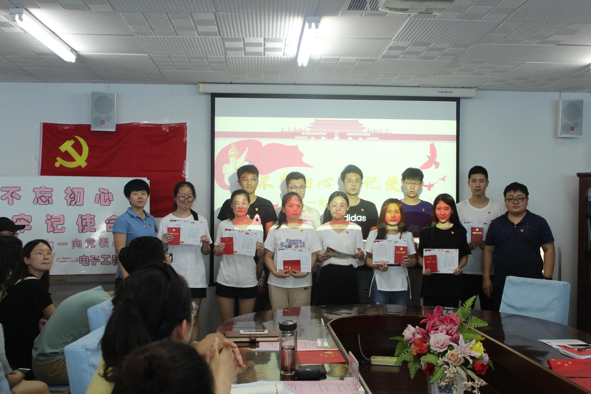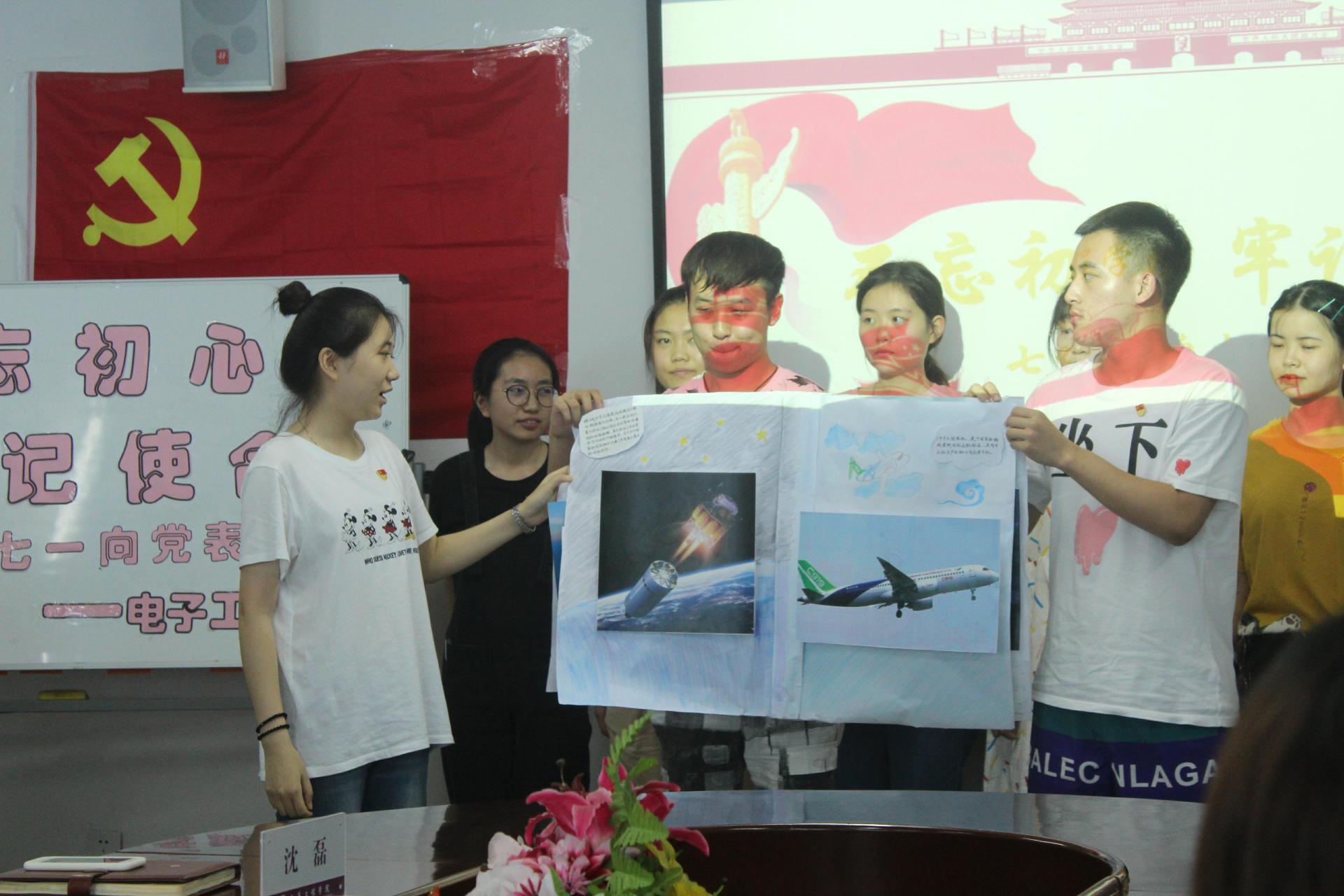 随后,由各支部书记为支部新发展的党员他们佩戴党徽、颁发生日卡和党章,教育大家要牢记政治生日,铭记初心。每名同学面对党旗向党表心愿,纷纷表示会以更严格的标准要求自己,向优秀党员学习!同时,各支部党员也为党成立98周年献上祝福。有自编自导三句半表演,表达学生党员敢于担当、报效社会的决心;有进行情景剧表演,还原革命英雄江姐的斗争历史,颂扬不惧牺牲的革命精神;有亲手绘制党的发展历史画册,彰显党的建设伟大成就;有为党和国家送上祝福的合唱及朗诵表演《我宣誓》和《唱支山歌给党员》;有为党的98周岁生日献上生日贺卡,祝福党和国家不断繁荣富强。会上,全体党员再次面向党旗,重温入党誓词。