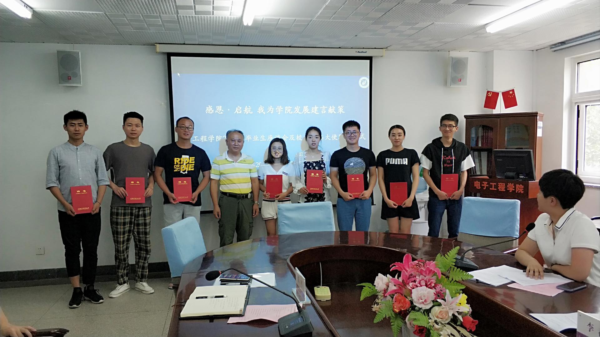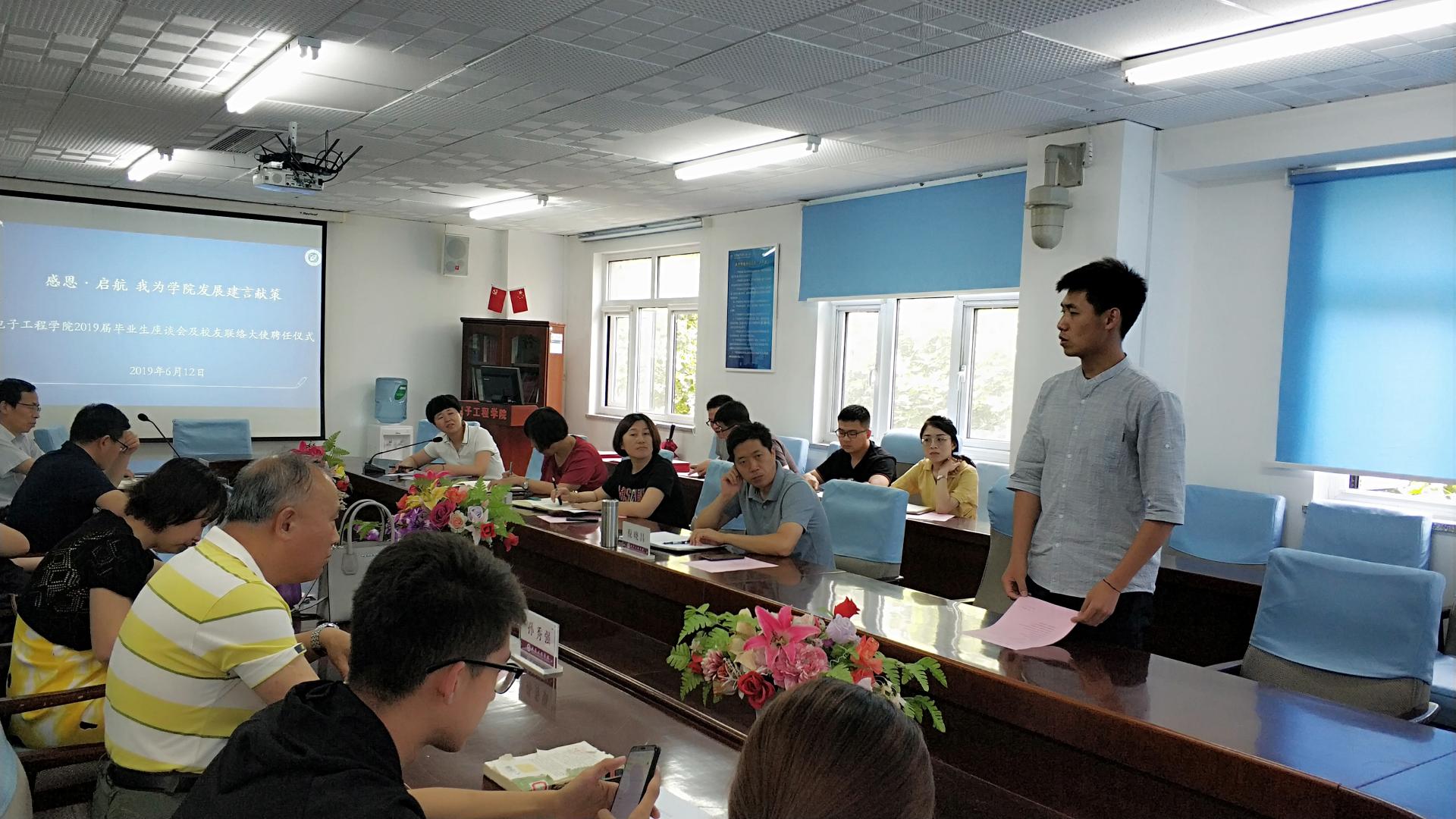 在机电楼326开展主题为“感恩·启航——我为学院发展建言献策”的2019届毕业生座谈会暨校友联络大使聘任仪式。学院党委书记李春华、院长张军、副院长刘芬、副书记刘娜、副院长李士心、各系主任、全体辅导员以及毕业生代表出席会议。