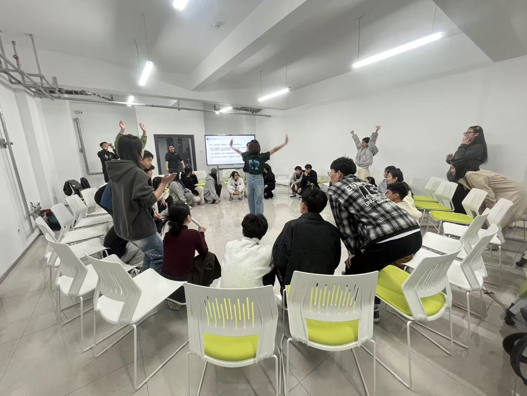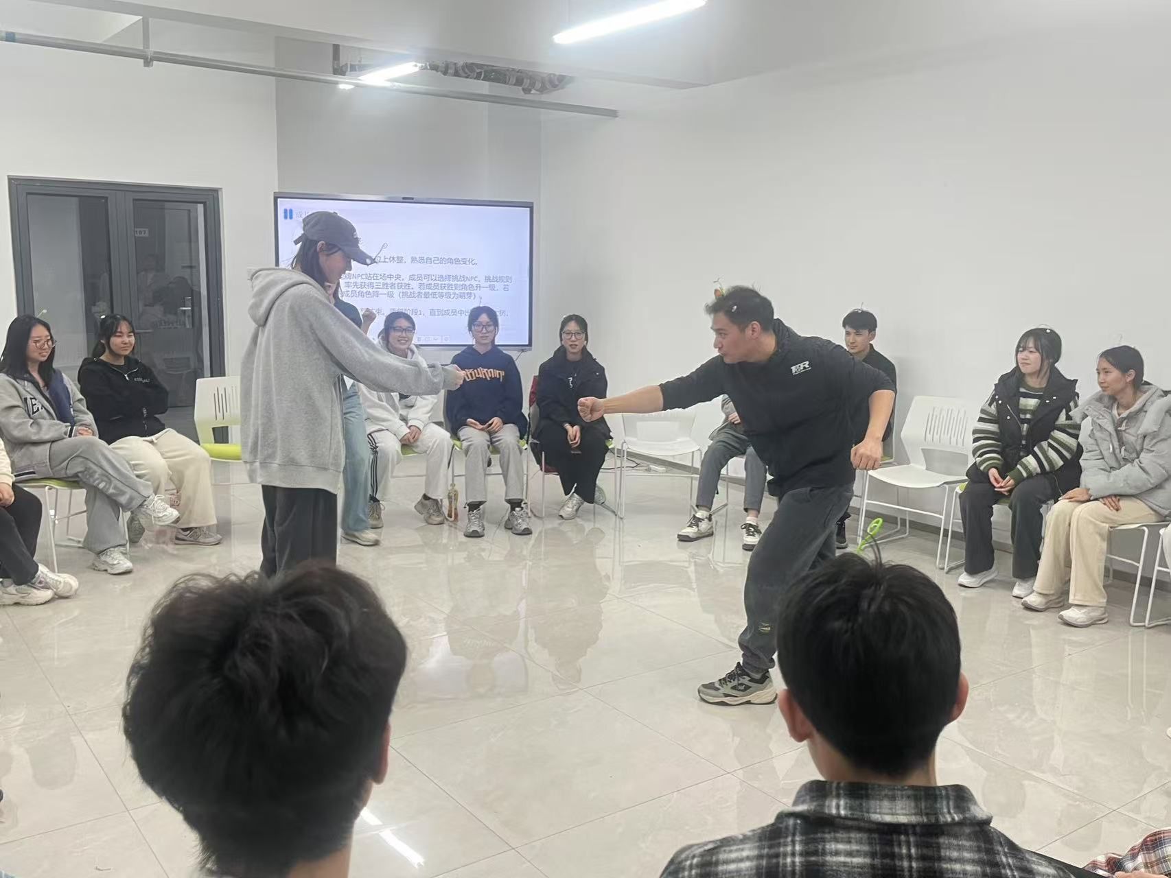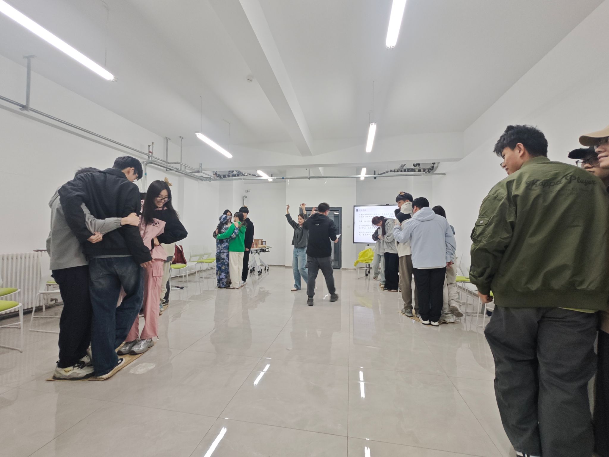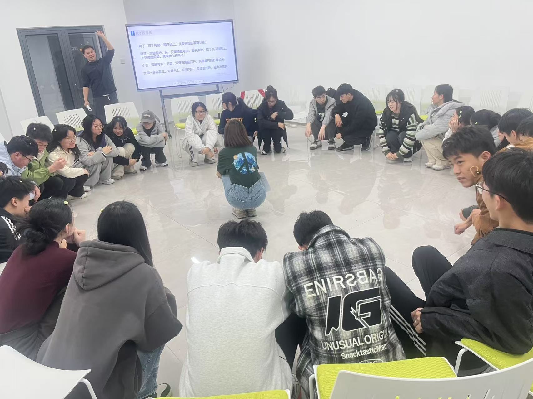 320日,延续首期活动建立的安全信任感,本期热身环节将呼吸融入到健心操中,将肢体运动与呼吸调节相结合,引导学生们在动态中感知身心联结。雨点变奏曲中,学生们通过动作幅度的变化细腻体验成长四部曲——从萌芽破土到参天大树的生命历程。随后的触碰彩蛋、野蛮生长等环节,通过情景模拟呈现人生路径的多样性,强化团队支持的力量。