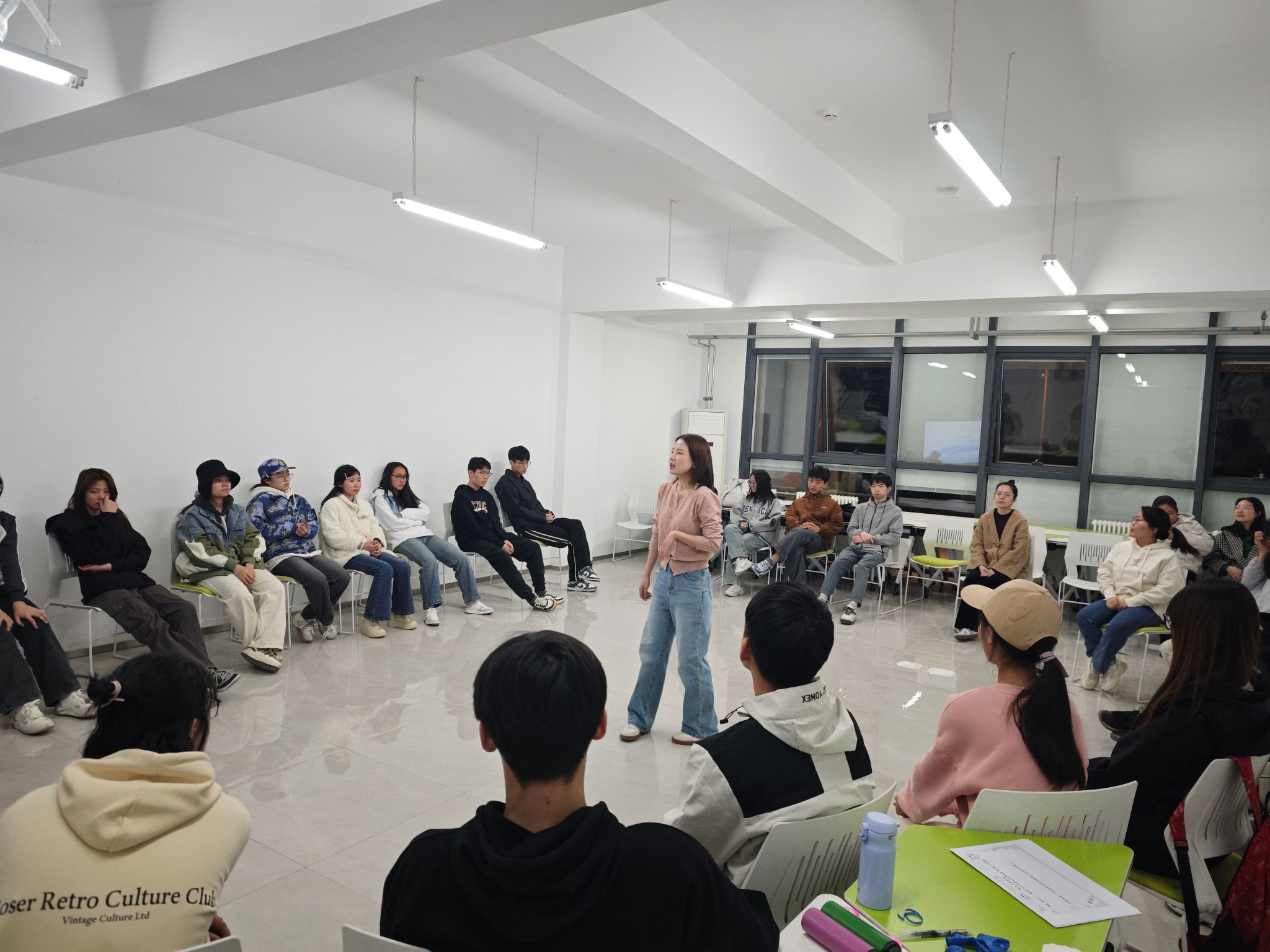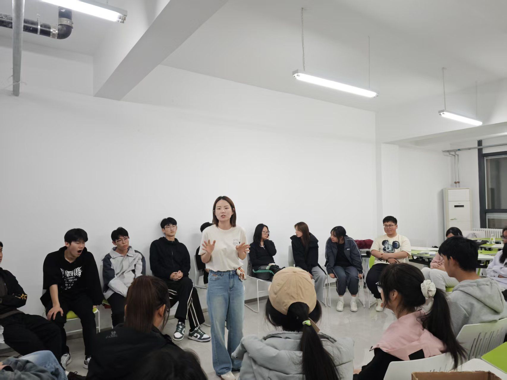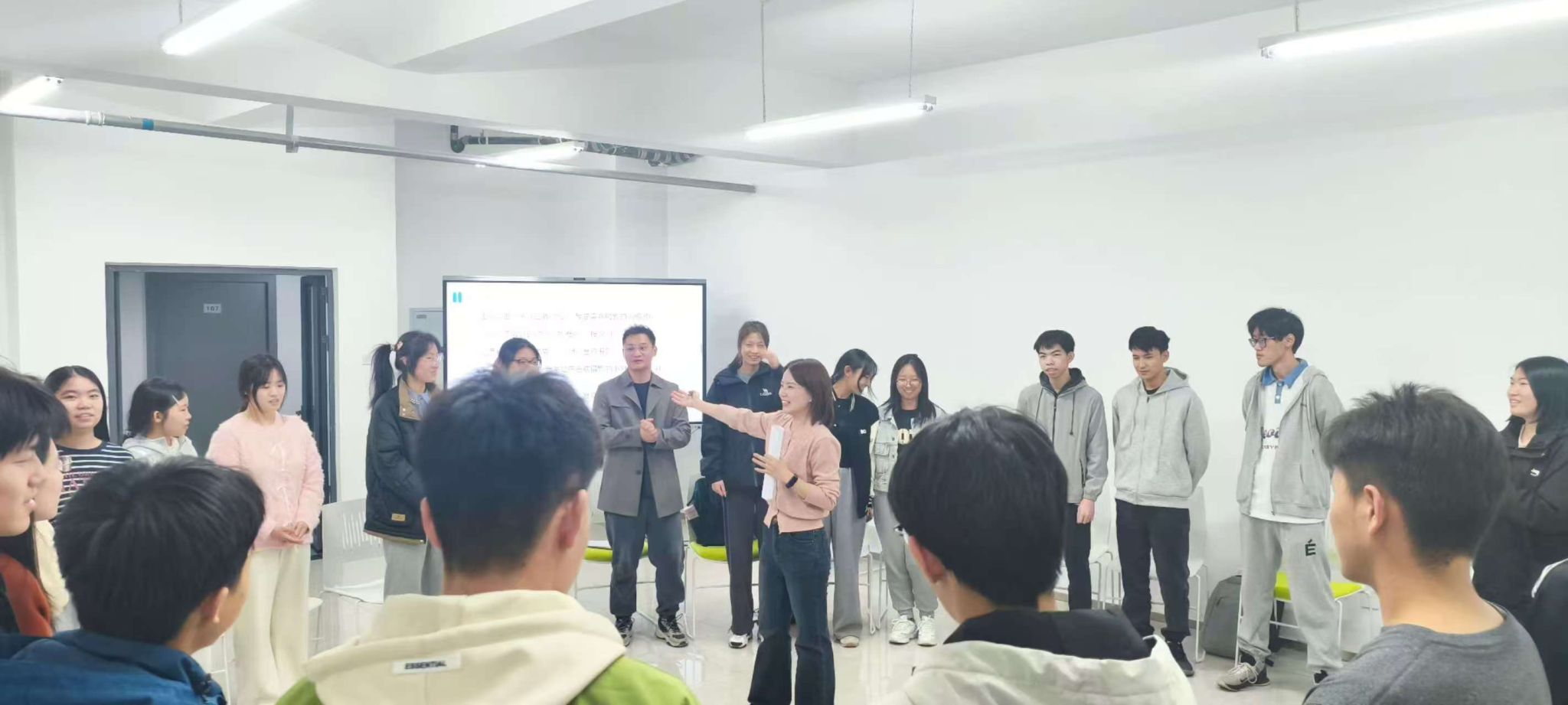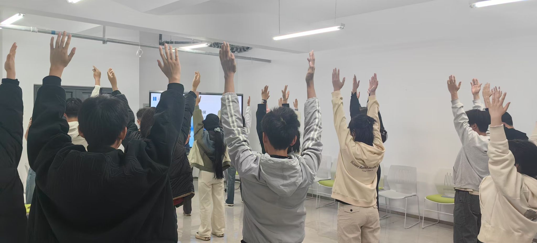 320日,延续首期活动建立的安全信任感,本期热身环节将呼吸融入到健心操中,将肢体运动与呼吸调节相结合,引导学生们在动态中感知身心联结。雨点变奏曲中,学生们通过动作幅度的变化细腻体验成长四部曲——从萌芽破土到参天大树的生命历程。随后的触碰彩蛋、野蛮生长等环节,通过情景模拟呈现人生路径的多样性,强化团队支持的力量。