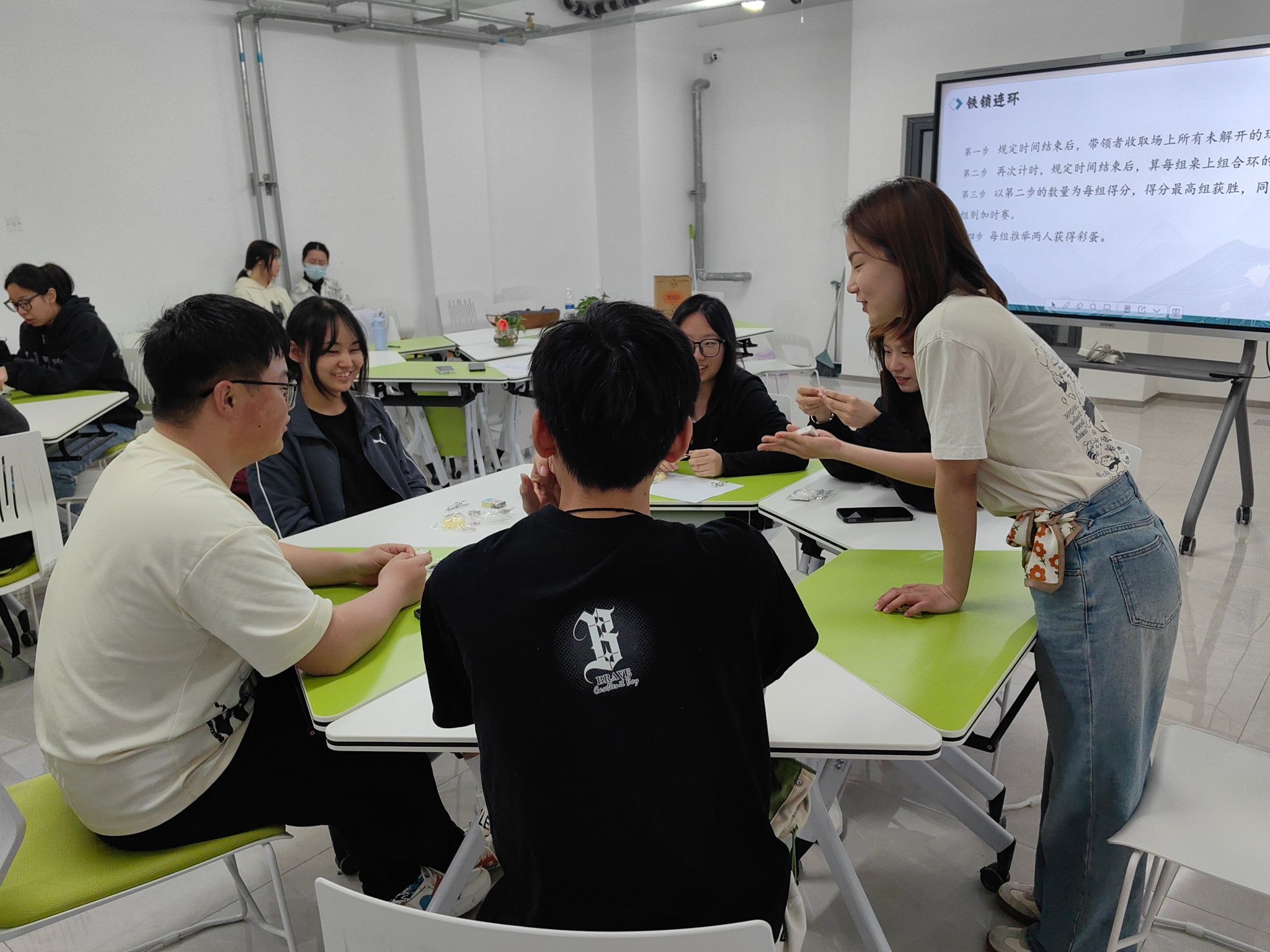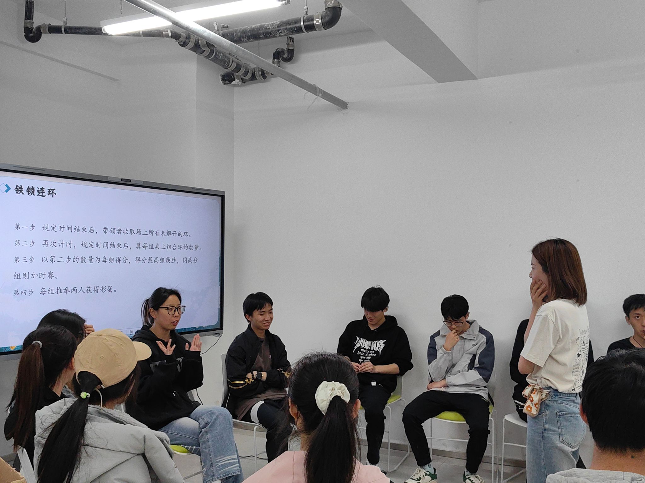 4月10日“允许一切皆如是”活动中,将心理舒缓与热身操相结合,以沙包爆开意象唤醒主动正念通过“铁锁连环”解锁游戏模拟困境突破采用自动导航的正念讲解方式,发掘困难时的无意识行为。借助三分钟呼吸与困难共处的正念指导语言,与过去的自己对话从过去发觉自己、安抚自己。当结束铃声响起有学生红着眼眶说:“原来接纳不完美的自己,才是成长的开始。”