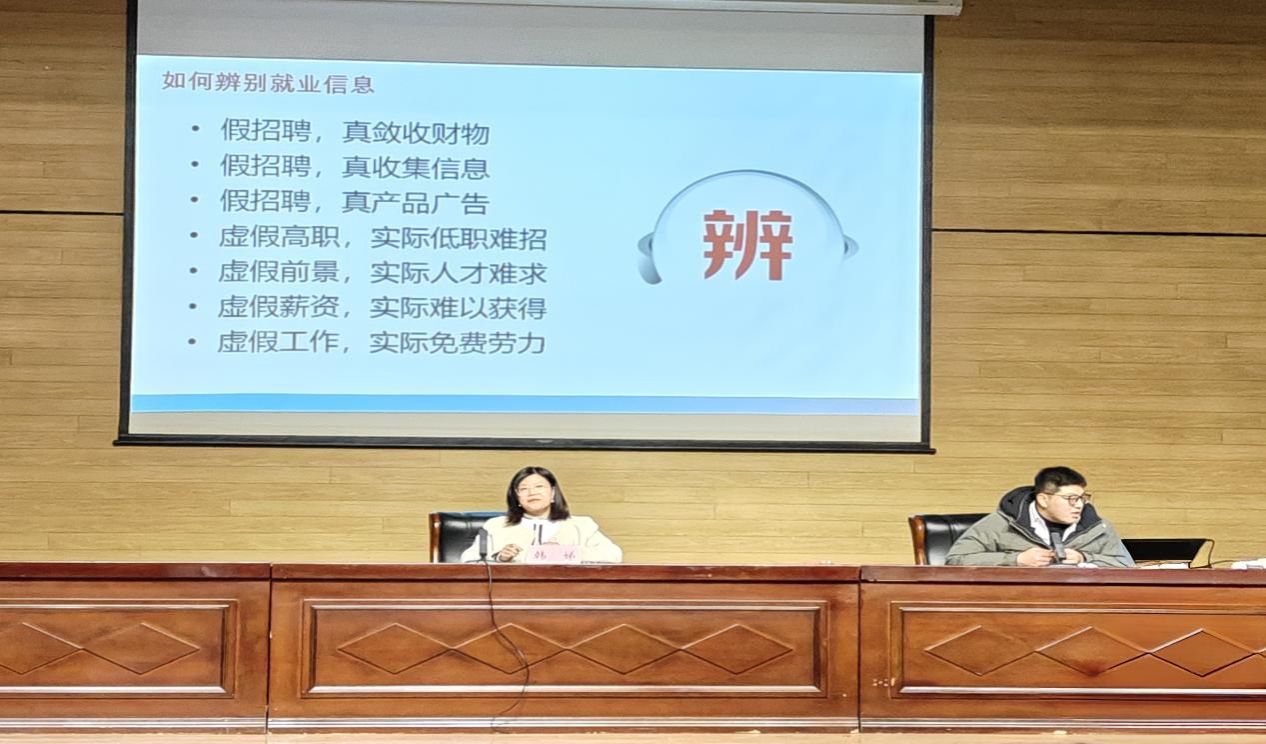 毕业班辅导员刘小琳以当前就业形势为切入点,分析了2025届毕业生面临的机遇与挑战,鼓励学生提前做好职业发展与规划,提高对就业招聘信息获取的精准度,把握好就业方向;同时提醒毕业生在找工作的过程中,强化安全意识,提高对虚假招聘信息的识别力。