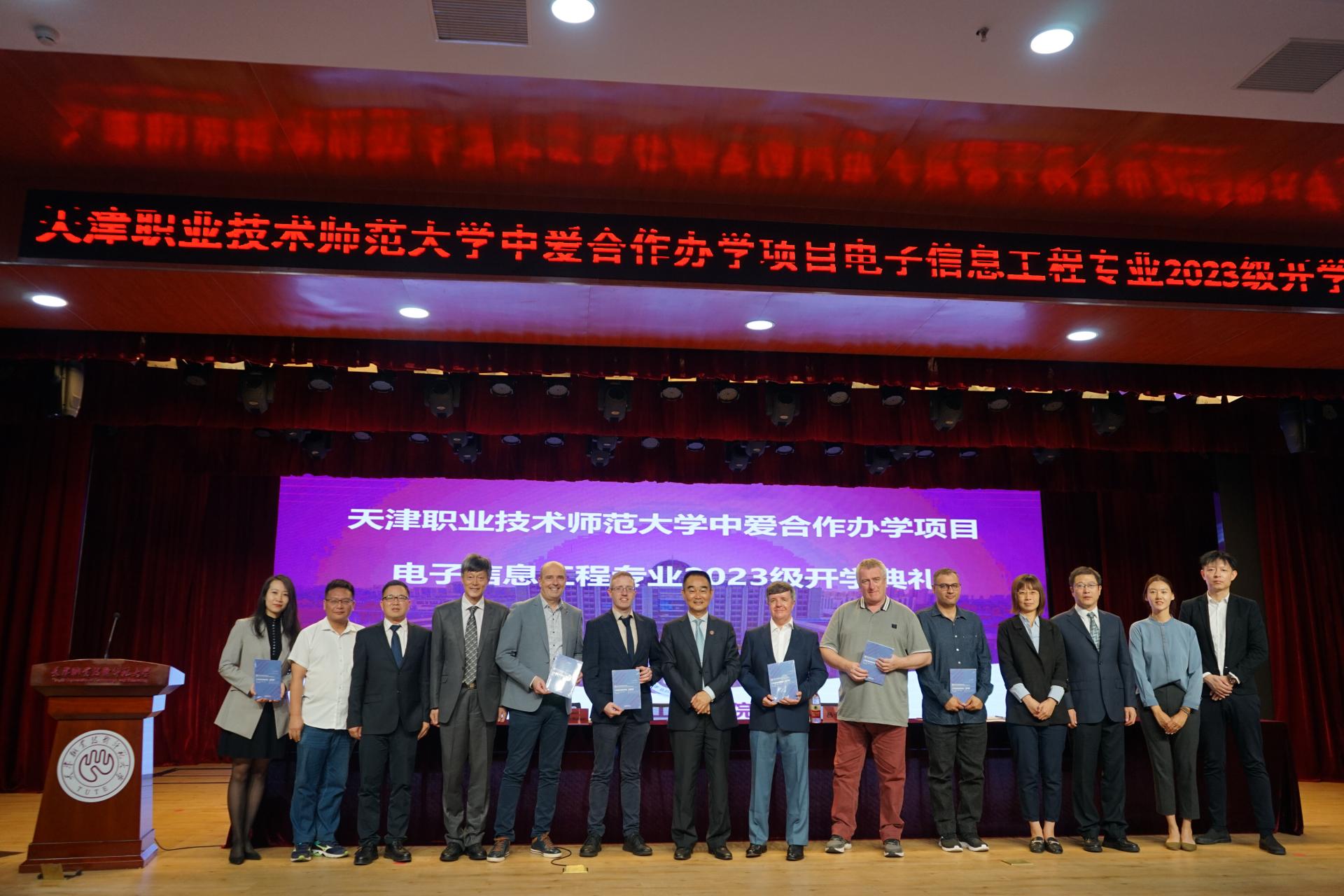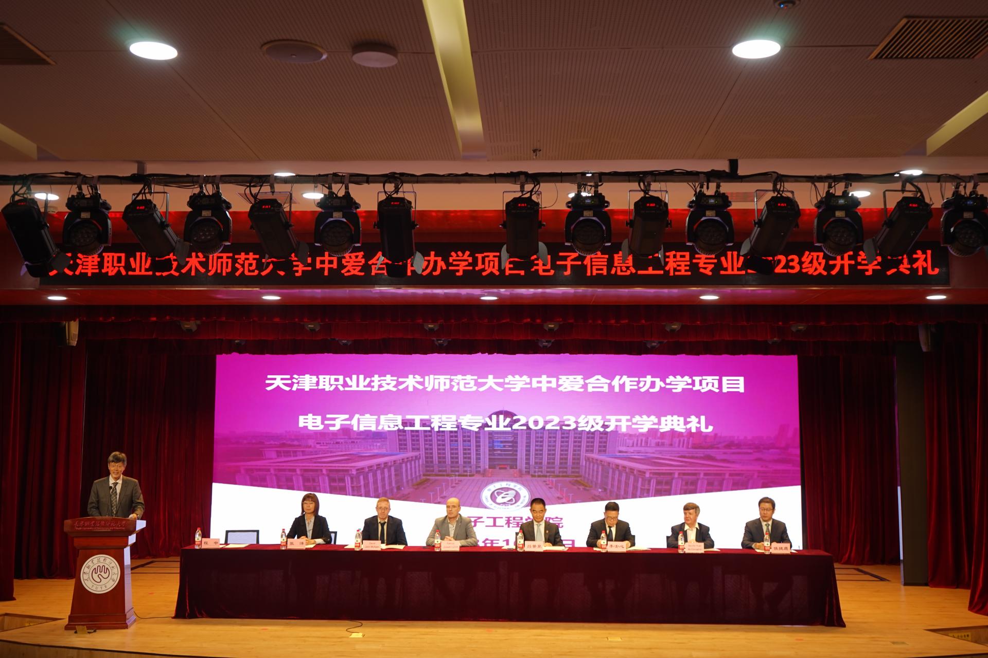 与爱尔兰大西洋理工大学在大学生活动中心四楼展演厅举行合作办学项目电子信息工程专业2023级开学典礼。大西洋理工大学国际交流学院院长Patrick Lynch、机械工程学院院长David John Mulligan,生命科学学院院长Neville Hugo McClenaghan,成人用品
