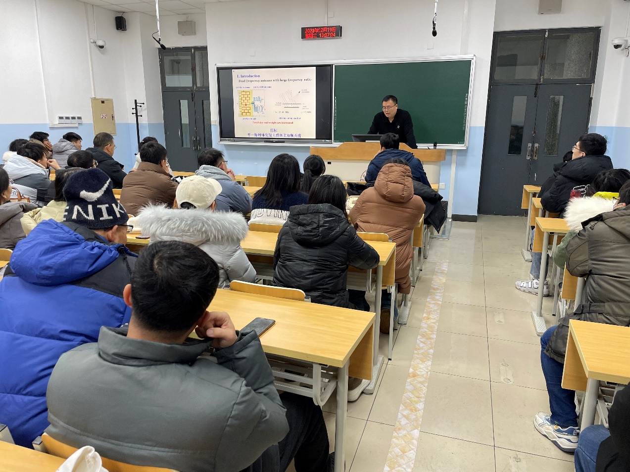 首先,姬五胜向大家介绍了冯立营教授、李泉副教授的主要科研经历和代表性科研成果。随后,冯立营教授做题为“大频率比双频天线研究进展”主题报告,介绍天线与微波技术重点团队近年来在大频率比双频天线方面取得的研究进展,特别是2023年针对大频率比双频磁电偶极子天线和大频率比双频八木-宇田天线取得的新成果。李泉副教授做题为“太赫兹电磁诱导透明超表面器件”主题报告,主要利用电磁诱导透明效应,并结合超表面设计思想,设计了3种工作在太赫兹波段的新型功能器件。分享结束后,两位主讲人都与现场的师生进行了交流,并耐心地回答老师们提出的问题,拓宽了大家的科研思路。