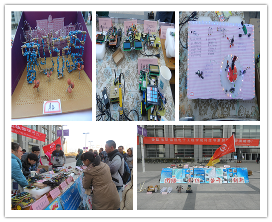 回到学校后,协会还将工艺类和电子技能类科技作品在A楼广场进行了开放式展览,吸引了许多同学驻足观看。