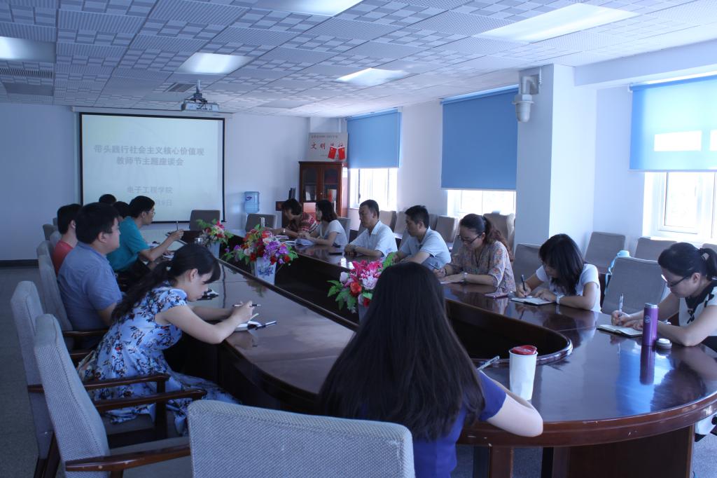 在机电楼326会议室召开“带头践行社会主义核心价值观” 教师节主题座谈会。学院领导班子成员、学科带头人及中青年教师代表参加了座谈。座谈会由党总支书记李春华主持。