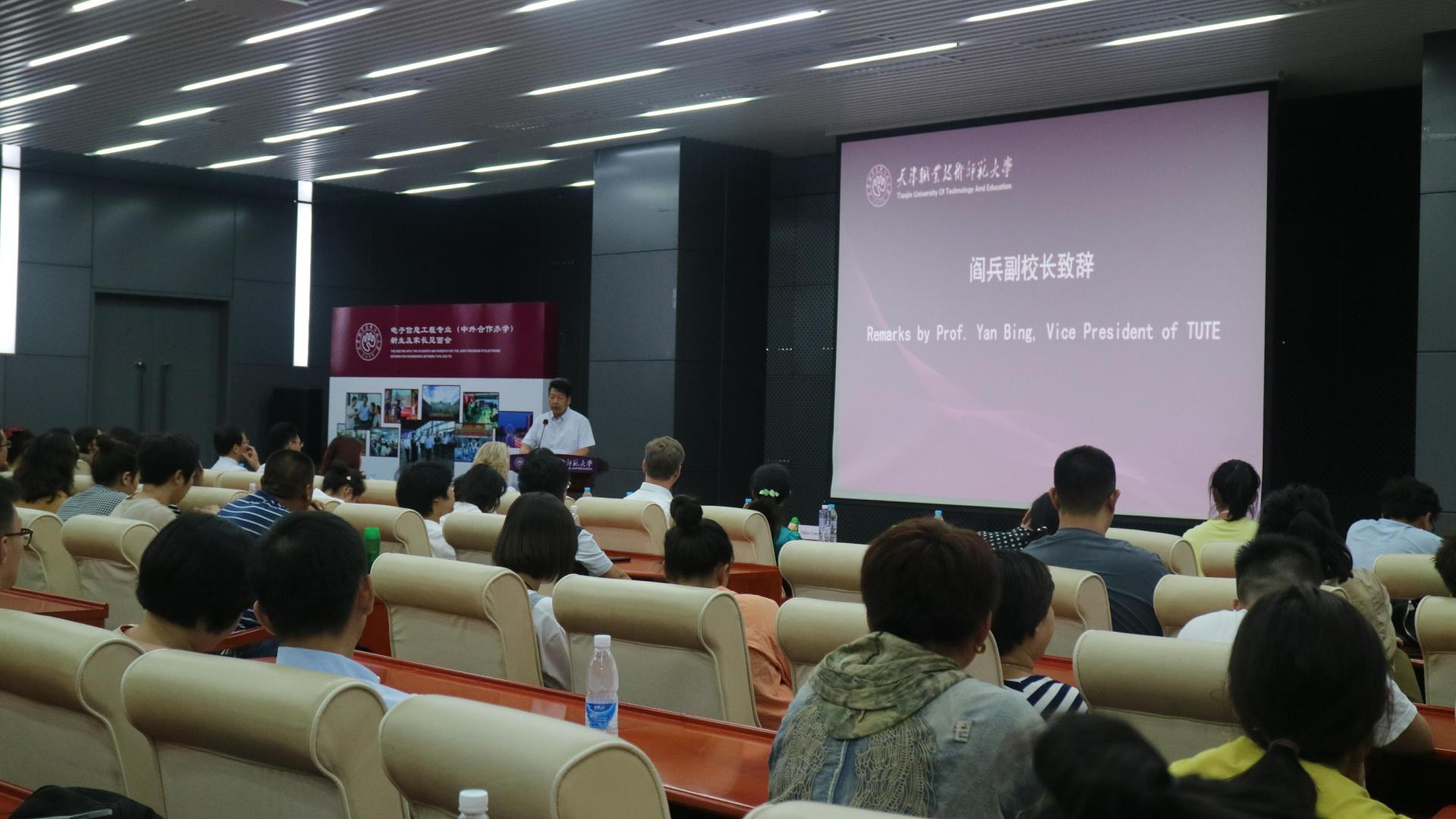 阎兵副校长在欢迎辞中代表学校对新生和家长们的到来表示欢迎,同时对Lavina Collins参赞的出席表示感谢,对天职师大的发展历程、成果以及合作办学项目基本情况向新生和家长做了介绍。他表示,希望各位同学在今后的大学生活中,能够认真把握求学机会、充分利用学习资源,丰富理论素养、提升实践技能,最终成长为全面发展的高素质人才。