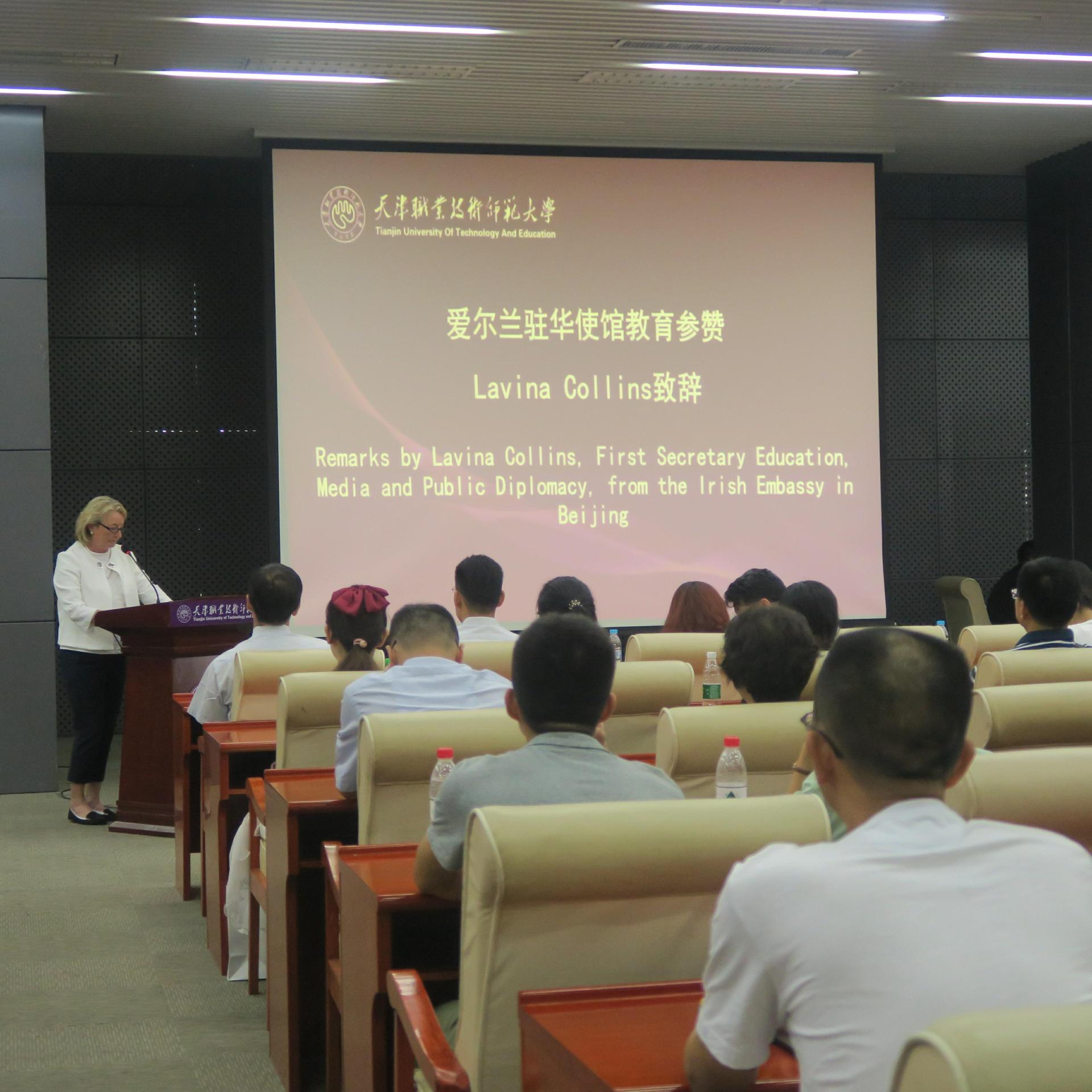 Lavina Collins参赞代表爱尔兰驻华大使馆和爱尔兰高等教育推广署发表讲话,对爱尔兰斯莱戈理工学院和天职师大合作办学项目表示大力支持。她详细介绍爱尔兰教育资源、留学爱尔兰的发展优势和电子信息工程专业职业环境,希望同学们将来能够有机会留学爱尔兰,拓宽自己的视野,在合作办学项目中不断进步,成长为独立自信的国际化人才。