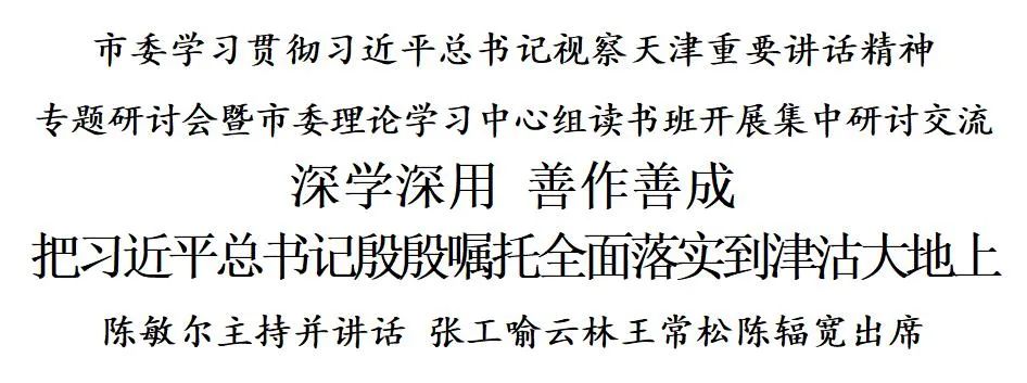 市委副书记、市长张工,市人大常委会主任喻云林,市政协主席王常松,市委副书记陈辐宽,市委常委,市人大常委会、市政府、市政协领导班子成员,市高级人民法院、市人民检察院、南开大学、天津大学主要负责同志,围绕学习贯彻习近平总书记视察天津重要讲话精神作研讨发言,结合思想和工作实际,谈认识、谈体会、谈打算。通过学习研讨,大家愈发感到习近平总书记重要讲话情怀之深切、思想之深邃、内涵之丰富,表达了感恩习近平总书记关心关怀、不辜负期望重托、扎实做好工作的信心决心。