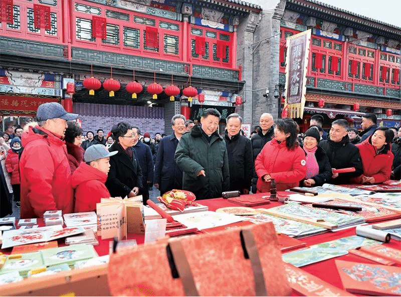 2024年2月1日至2日,中共中央总书记、国家主席、中央军委主席习近平来到天津,看望慰问基层干部群众。这是1日下午,习近平在天津古文化街考察时,同店铺员工和现场群众互动交流。新华社记者 谢环驰/摄