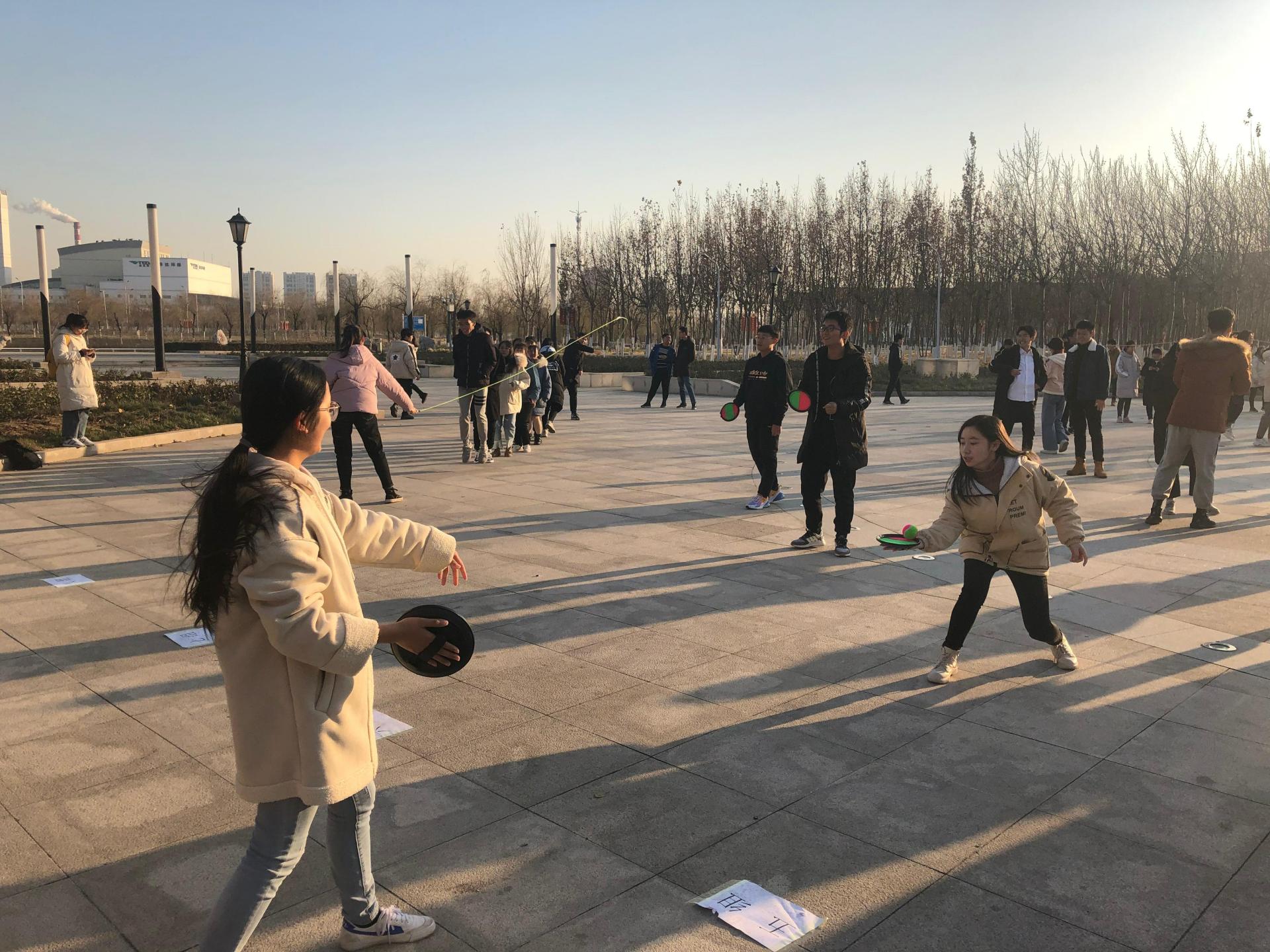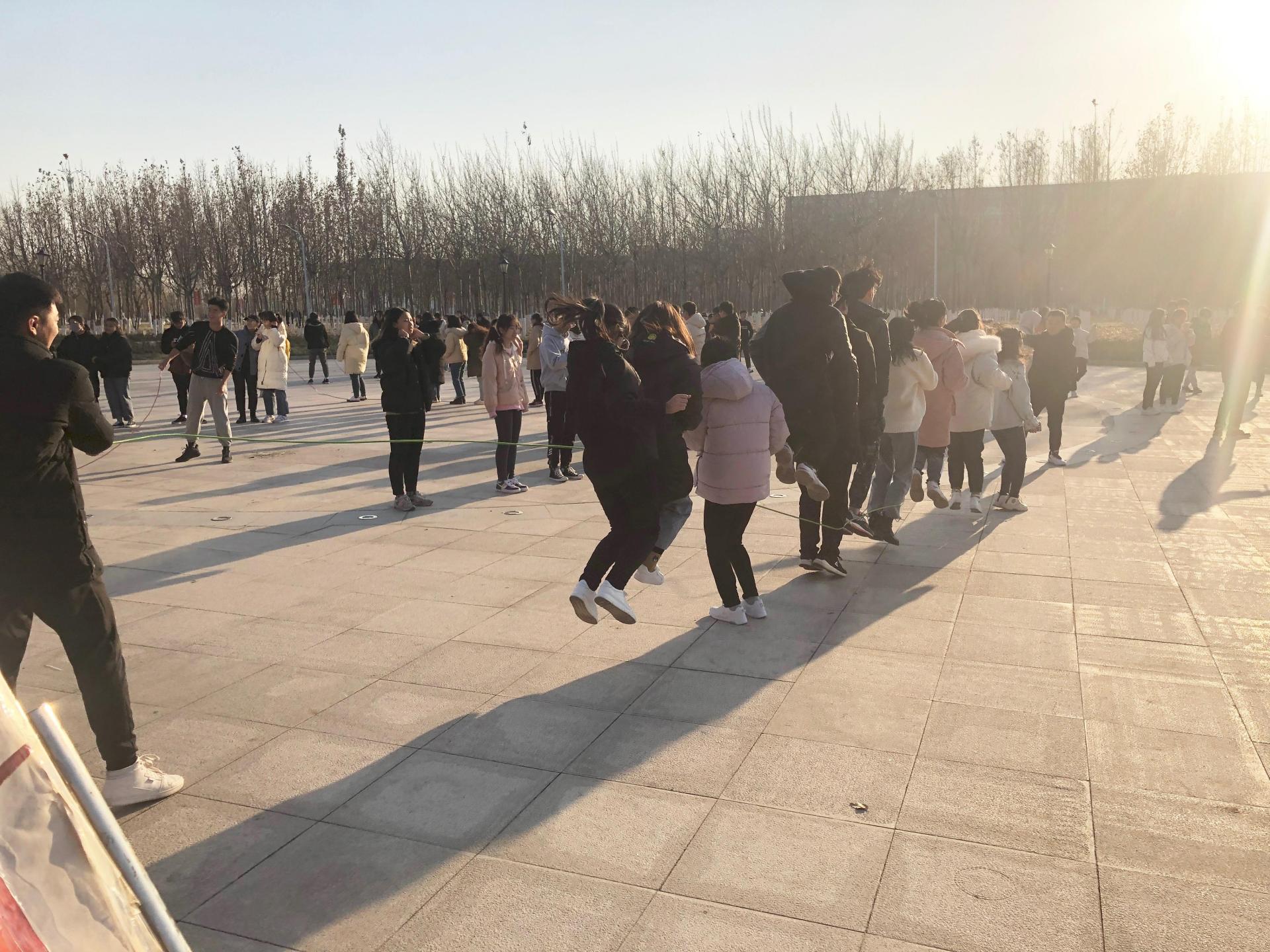 接着进行的是多人跳长绳比赛。首先是每个人单独跳,来回穿梭走阿拉伯数字“8”的队形,选出优胜的队伍,接着让优胜的队伍进行多人跳比赛,即逐渐增加同时跳绳的人数,人数最多且跳的最多的队伍获胜。这个项目锻炼的是团队的默契与配合,以及每位同学自身四肢的协调性。通过同学们互相的沟通与交流,达成默契,赢得比赛的过程,也是大家相互了解,完全破冰的过程。这个游戏结束后,大家明显互相亲近了许多。