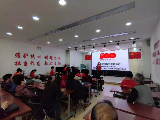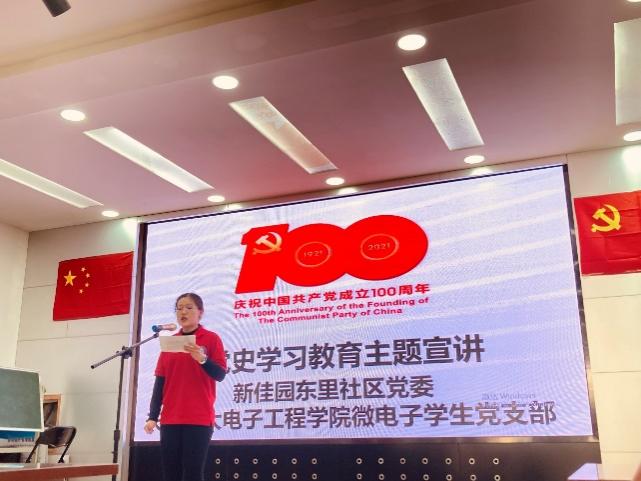 为向大家宣传学习党史,微电子学生党支部制作了中国共产党建党一百周年学党史的宣传单,将其发到了社区居民的手中,同时宣讲了2021220日习近平总书记在党史学习教育动员大会上的讲话精神,明确了学习党史的重要意义,为庆祝中国共产党成立一百周年作出自己的努力。在社区宣传过程中,有着几十年党龄的老人们向学生党员表达了殷切的希望,青年大学生党员与长辈们深入交流,重温我党百年来的艰辛奋斗历程。
