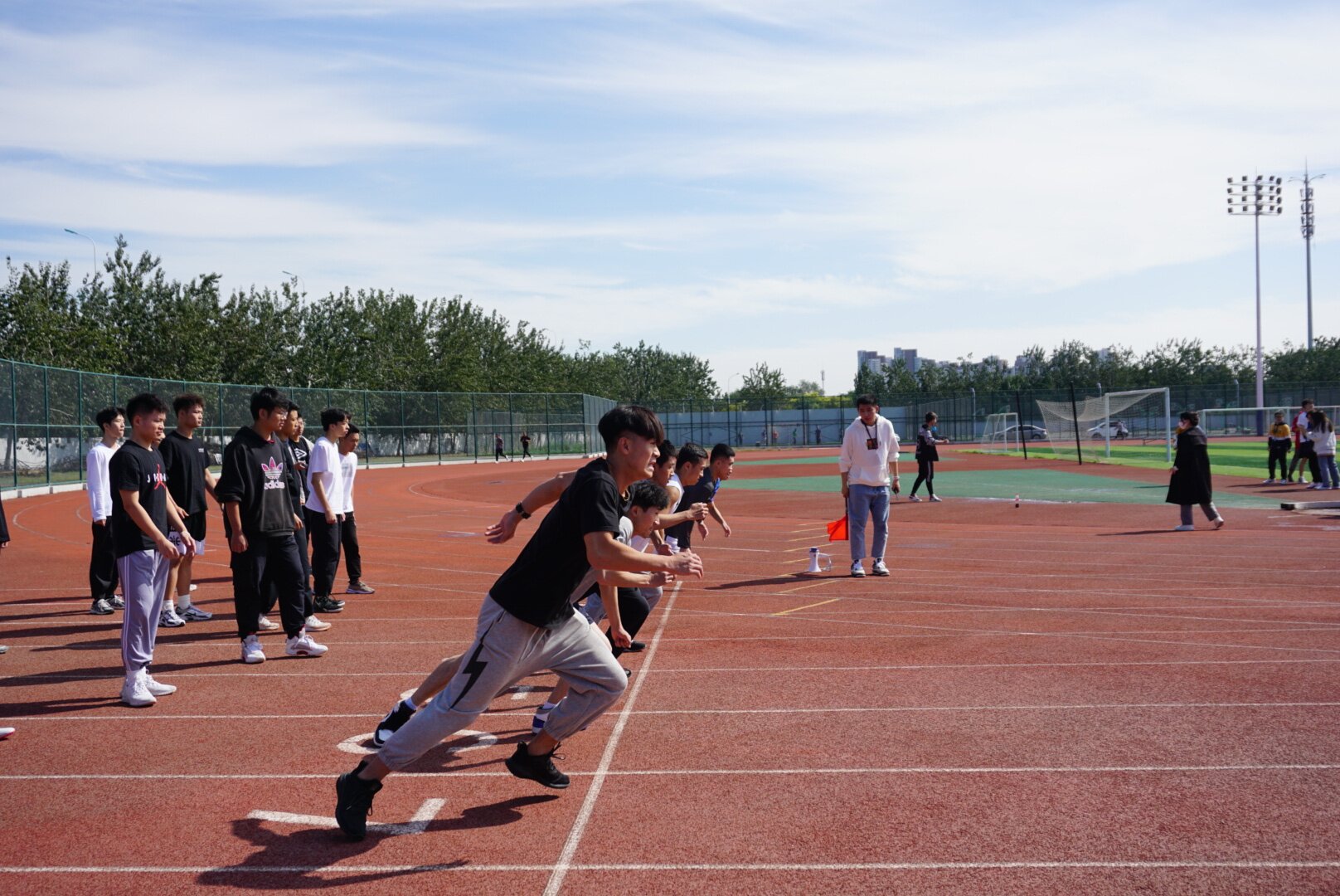 男子100米短跑是此次运动会的第一个项目,裁判的一声“各就各位,预备,跑”,点燃了整个赛场。