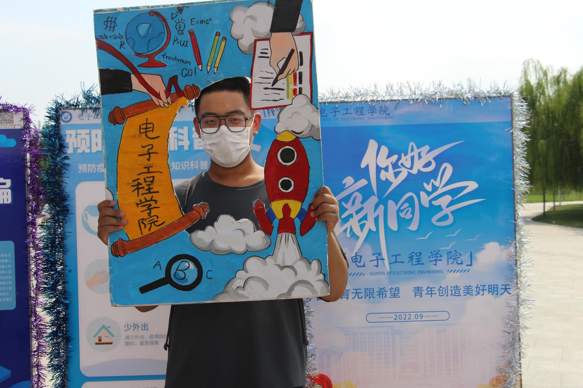 办理好报到手续后,新生们在迎新展板前定格当下的喜悦。